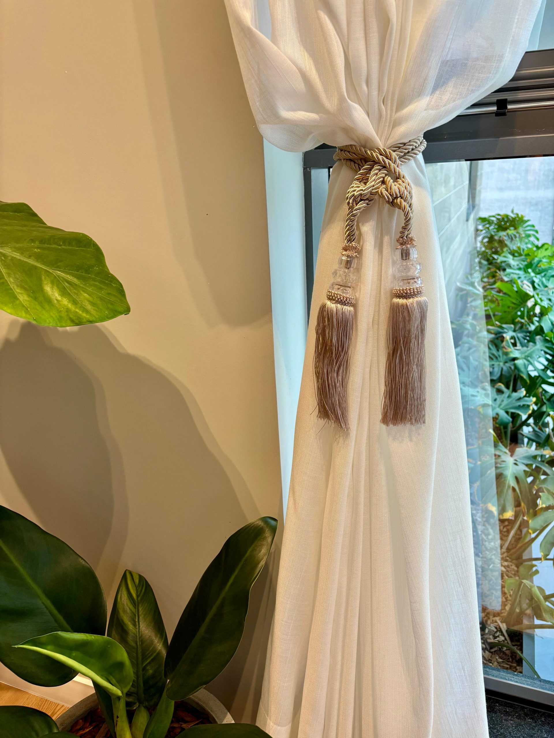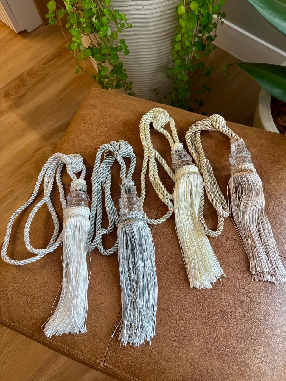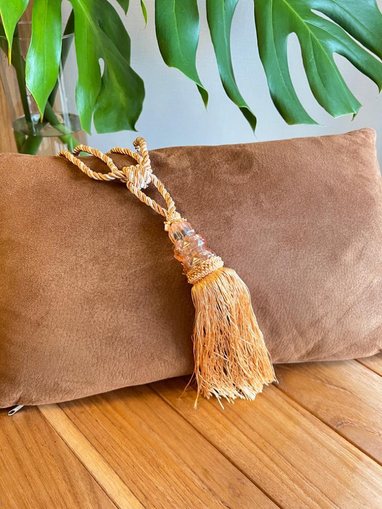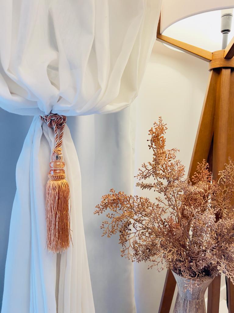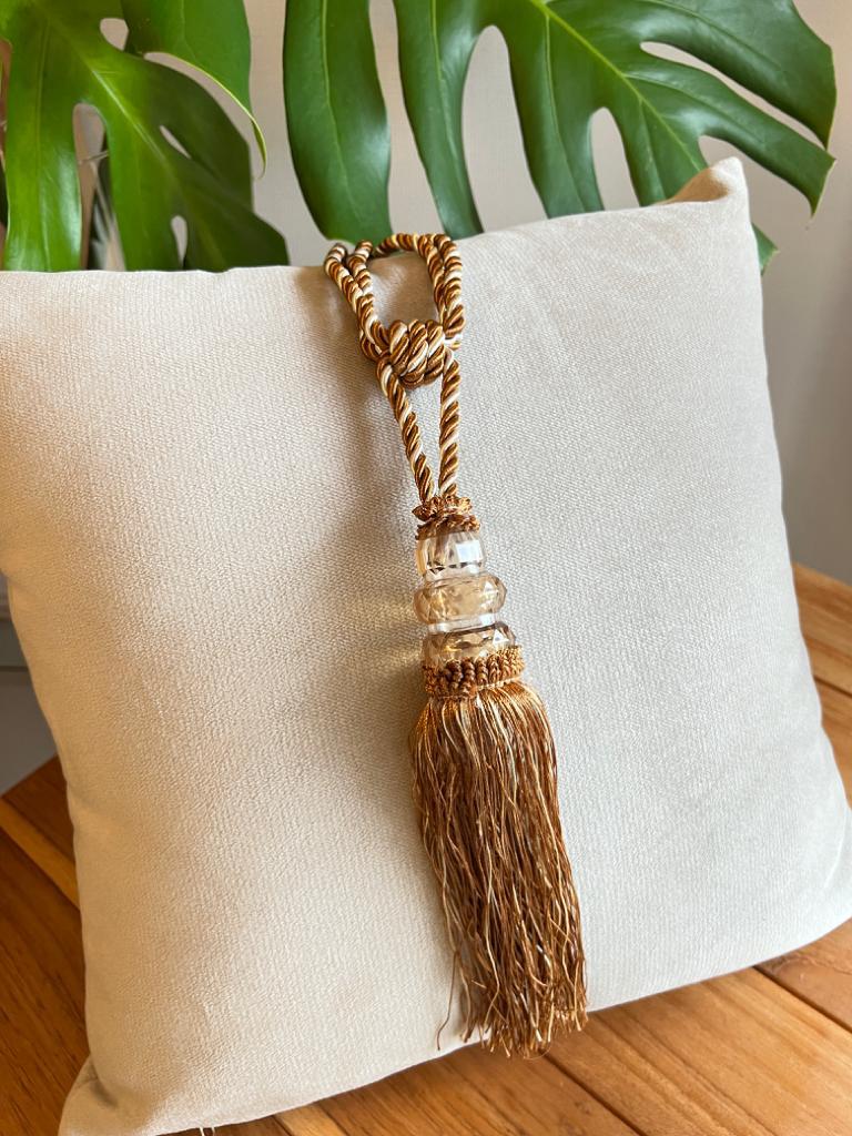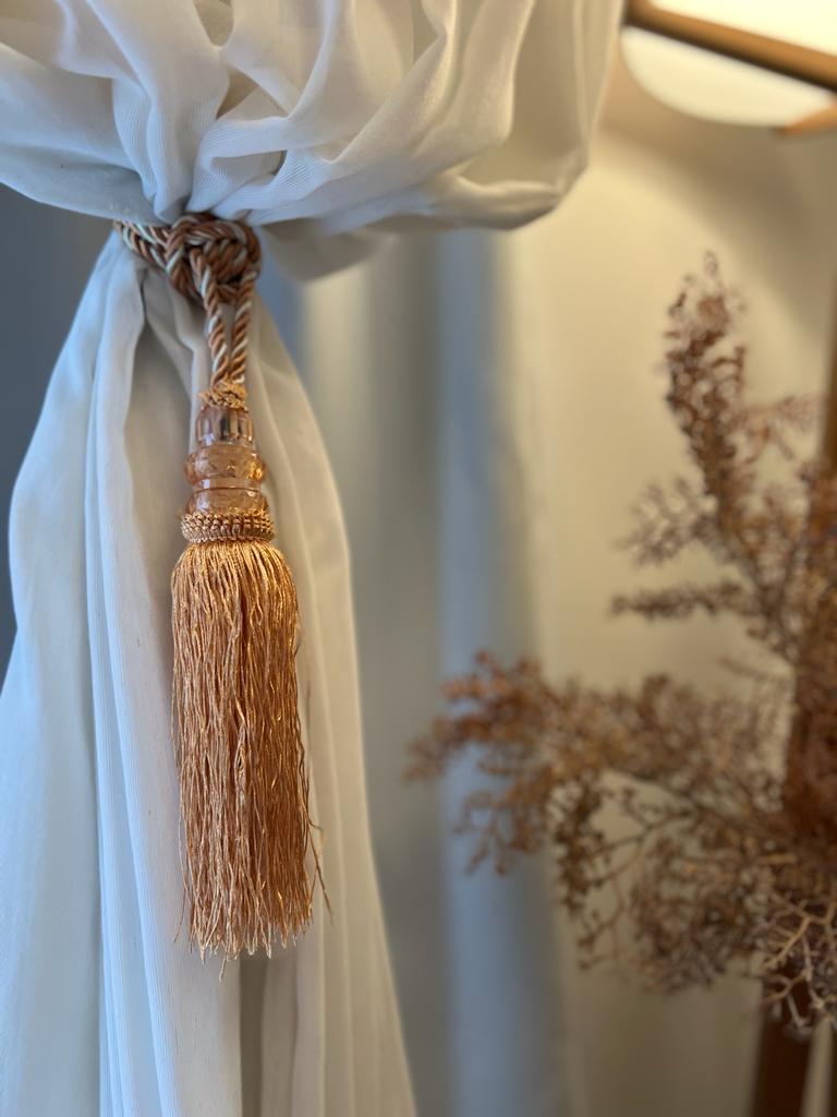 O entrelaçado no cordão confere um toque artesanal, enquanto o enfeite de franja volumoso cria um caimento elegante que valoriza o tecido.
