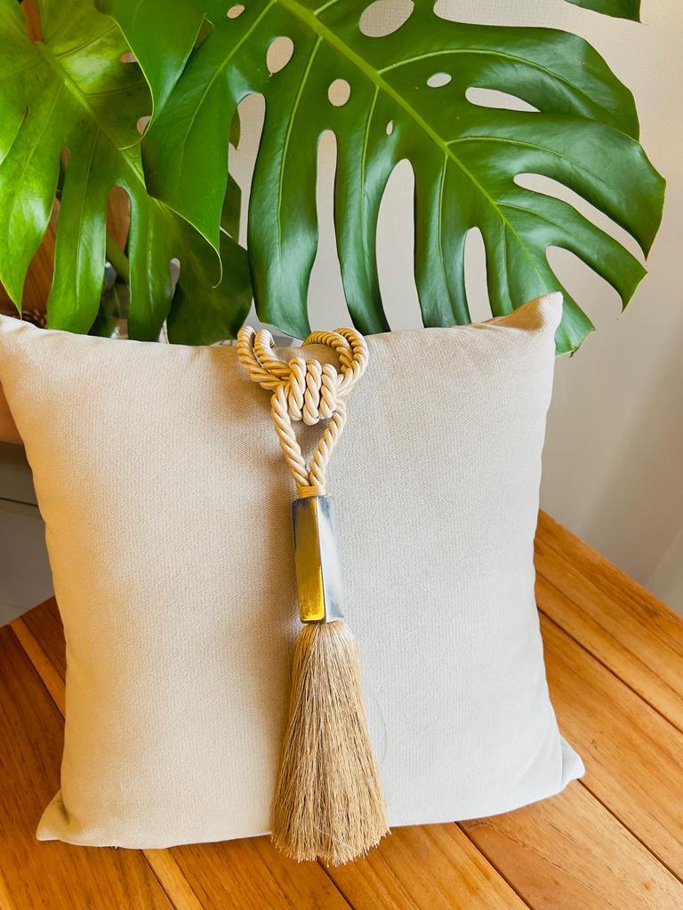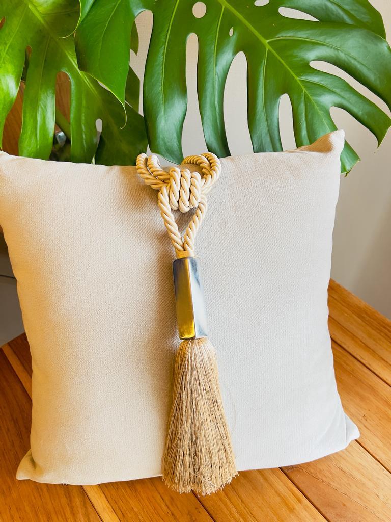 O cordão entrelaçado reforça a estética artesanal, tornando essa peça ideal para composições elegantes que valorizam texturas e detalhes.